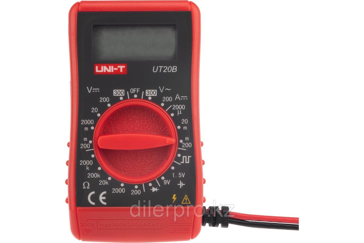 Карманный цифровой мультиметр Uni Trend UT20BUni Trend UT20B – компактное малогабаритное цифровое измерительное устройство типа мультиметр, оснащенное широким набором измерительным функций и опций. Благодаря своему портативному корпусу и небольшим размерам прибор чрезвычайно удобен в эксплуатации. Его можно брать с собой в любых ситуациях. Оборудование соответствует стандарту IEC1010, категории по перенапряжению CAT II 300V, отвечает второй степени загрязнения 2 и обладает двойной изоляцией. Функционал UNI-T UT20BUni Trend UT20B обеспечивает измерение переменного напряжения в диапазонах двести и триста вольт. Для постоянного напряжения измерительные пределы составляют двести милливольт, две тысячи милливольт, двадцать, двести, триста вольт. Постоянный ток определяется в интервалах две тысячи микроампер, двадцать и двести миллиампер. Сопротивление измеряется в диапазонах двести, две тысячи ом, двадцать, двести и две тысячи килоом. Помимо основных измерительных функций, мультиметр оснащен опцией тестирования полуторавольтовых и девятивольтовых батарей и диодов. При работе генератора выходного сигнала напряжение на входных терминалах не должно превышать десяти вольт. Иначе можно повредить прибор. В оборудовании предусмотрена индикация разряда батарей, режима удержания, отрицательной полярности, также имеется функция предупреждения о перегрузке. Технические данные UNI-T UT20BМультиметр Uni Trend UT20B создан в габаритных размерах 95х52х26 миллиметров и весе около ста грамм. Наибольшее значение входного напряжения между его терминалами и землей достигает трехсот вольт. Защита входных терминалов представлена предохранителем диаметром пять на двадцать миллиметров силой тока две десятых ампера и напряжением двести пятьдесят вольт. Разрешение экрана устройства составляет тысяча девятьсот девяносто девять. Диплей обновляется со скоростью два-три раза в секунду. Прибор должен эксплуатироваться при температуре от нуля до сорока градусов, храниться – при температуре от минус десяти до плюс пятидесяти градусов при относительной влажности не более семидесяти пяти процентов. Доступно проведение измерений на высоте не превышающей две тысячи метров. Оборудование питается от двенадцати вольтовой батареи типа А23. Диапазоны измерения могут выбираться вручную. Особенности использования UNI-T UT20BКалибровка, ремонт и обслуживание UT20B должны осуществляться только квалифицированными специалистами персоналом. Попадание влаги на внутреннюю схему прибора может стать причиной повреждения мультиметра и даже электрического шока пользователя. До начала измерений прибор должен пройти внимательный осмотр. Его корпус и составляющие элементы, например, измерительные щупы, не должны иметь никаких повреждений и признаков неисправностей. Не рекомендуется превышать ограничительные пределы на входных терминалах устройства. Во время измерений не стоит поворачивать переключатель функций, его положение должно быть правильным. Любое нарушение внутренней схемы аппарата может повлечь за собой нарушение его нормальной работы и выход из строя. Работая с измерительными щупами не трогайте их металлические части. При высокой температуре, сильных электромагнитных полях, наличии взрывчатых веществ в непосредственной близости и других неблагоприятных условиях использование 